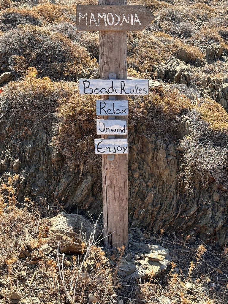 We walked down a well worn path to the beach. Mamoynia is a pebble beach along a rocky coastline. Dotting the shore are little tiny sandy beaches accessible by swimming or picking you way through the sandy shallows,
