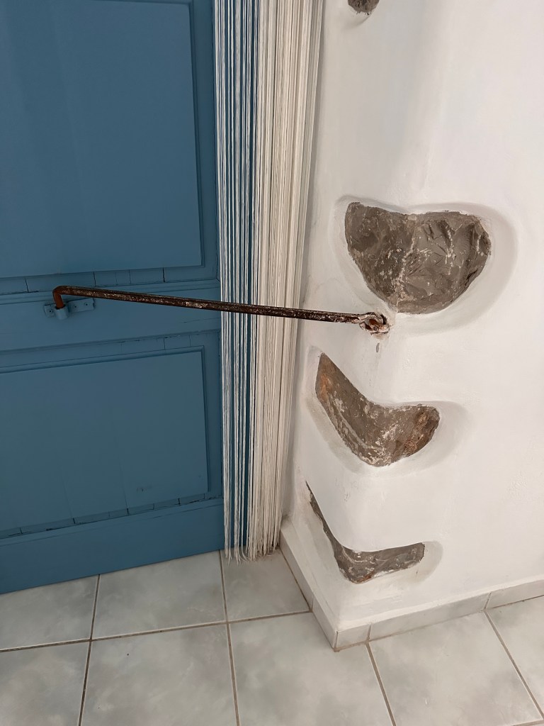The house that we are staying in lies just under the castle walls. We have a vestige of an ancient home security system on the back door which faces Livadi Bay. It is literally a bar that juts out from the wall and hooks onto the door making an effective barricade.